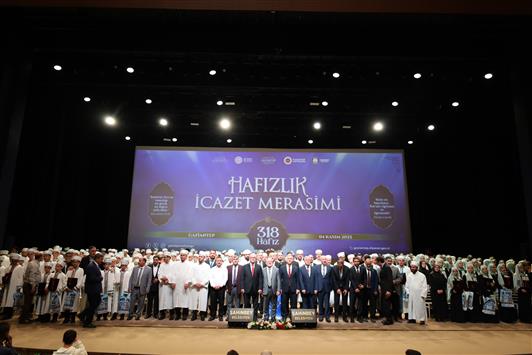 Kur'an Kurslarımızda hafızlık eğitimlerini başarıyla tamamlayarak mezun olan 211'i erkek, 107'si kız olmak üzere toplam 318 Hafız Öğrencimiz, Şahinbey Kongre ve Sanat Merkezi’nde düzenlenen “Hafızlık İcazet Merasimi” ile belgelerini aldılar.