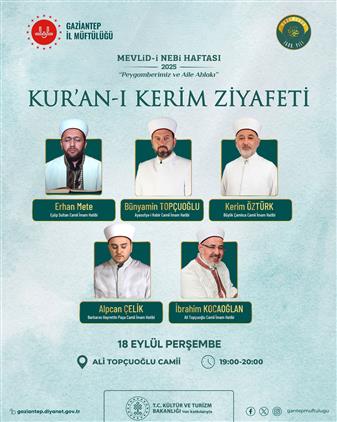 Mevlid-i Nebi Haftası münasebetiyle, İlimiz Şehitkamil Müftülüğü Ali Topçuoğlu Camii'nde birbirinden kıymetli hocalarımızın katılacağı "Kur'an-ı Kerim Ziyafeti" programı düzenlenecektir.