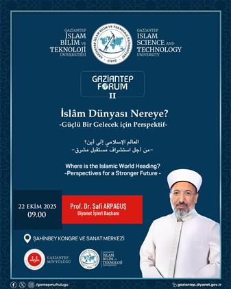 Diyanet İşleri Başkanımız Sayın Prof. Dr. Safi ARPAGUŞ Hocamızın katılımları ile Gaziantep İslam Bilim ve Teknoloji Üniversitesi tarafından “İslâm Dünyası Nereye? – Güçlü Bir Gelecek İçin Perspektif” ana temasıyla 22-24 Ekim 2025 tarihlerinde Gaziantep Forum II programı Şahinbey Kongre Merkezinde gerçekleştirilecektir.