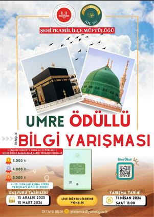 Türkiye geneli başarılı olan ilk 100 öğrencinin Umreye gideceği yarışmaya İlçemizde UMRE ÖDÜLÜNÜ KAZANANLAR HARİÇ Üniversite öğrencilerinden dereceye giren ilk on öğrencimize de ayrıca Müftülüğümüzce aşağıdaki şekilde ödüller verilecektir: